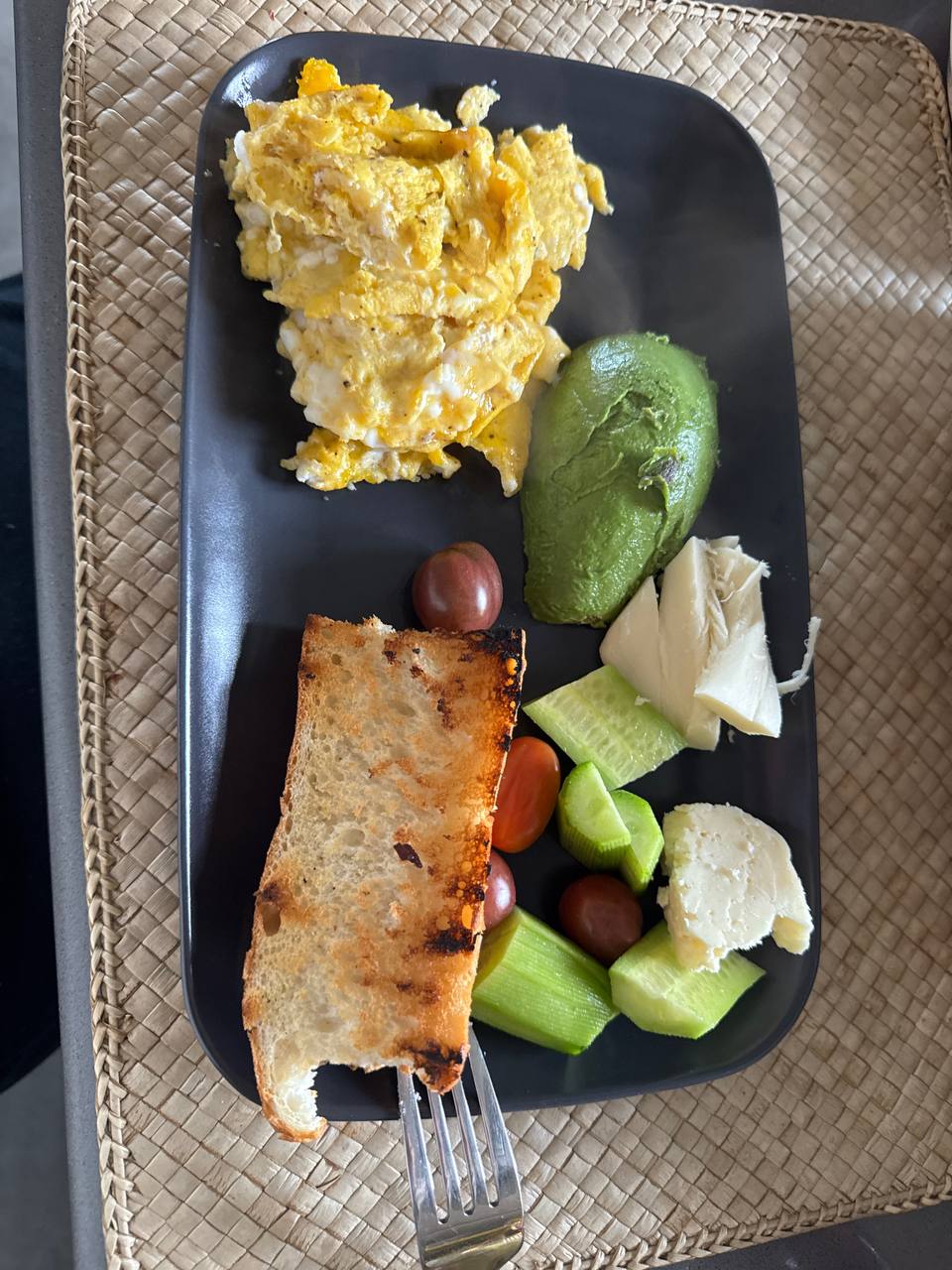 Scrambled eggs with avocado, feta cheese, olives, cucumber, cherry tomatoes, and toasted bread